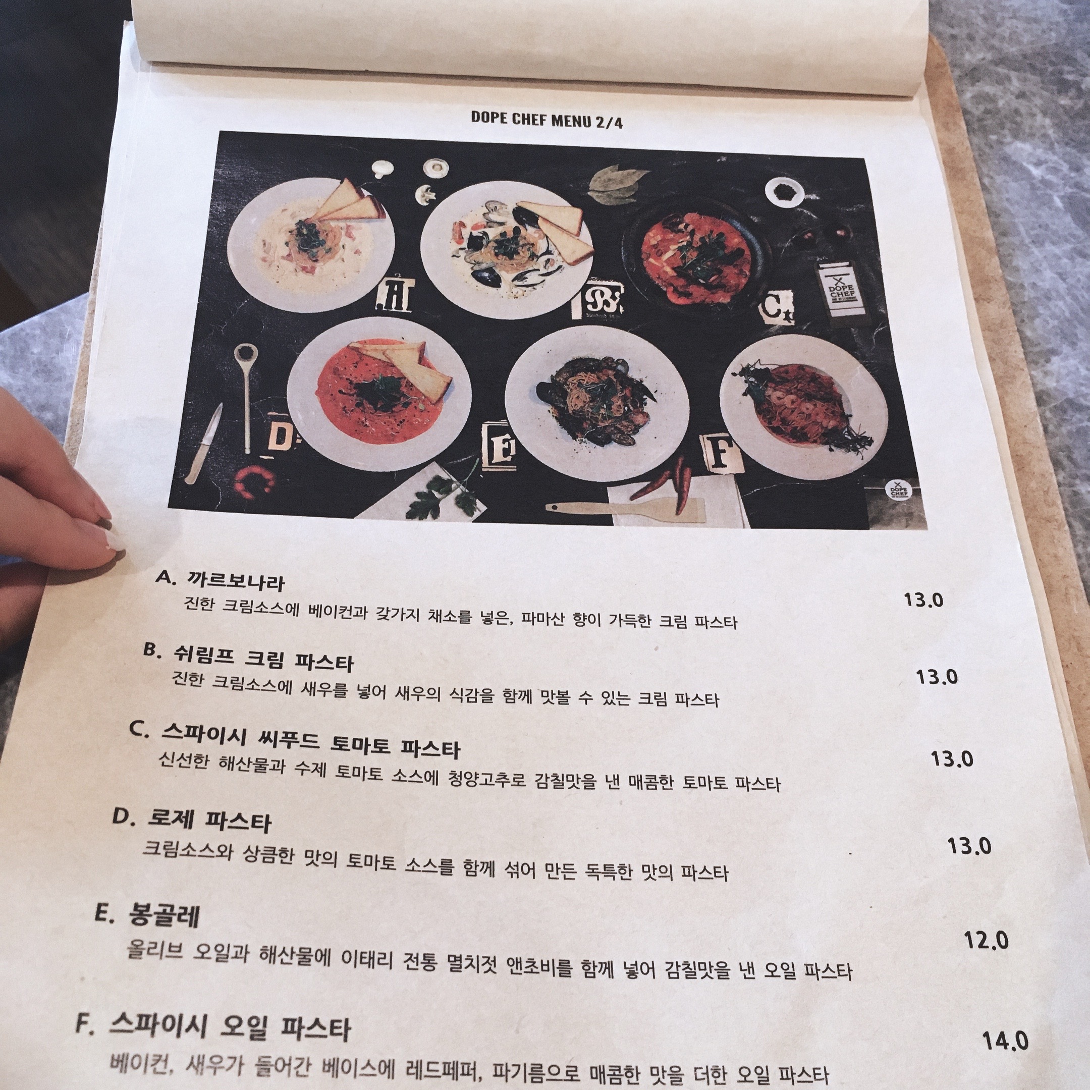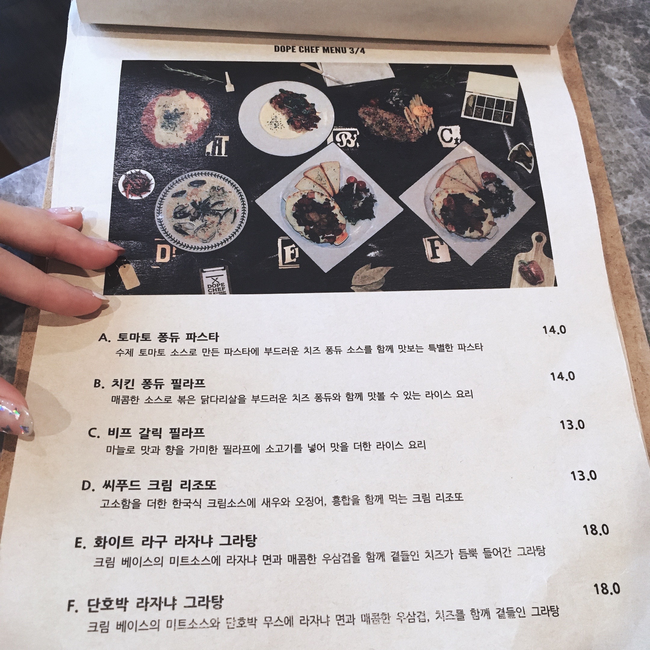 도프셰프의 대표 메뉴라 적혀있는 피자 라자냐를 시키기로 하고 파스타를 시킬지 스테이크를 시킬지 고민하다가 쉬림프 크림 파스타를 주문하였다.