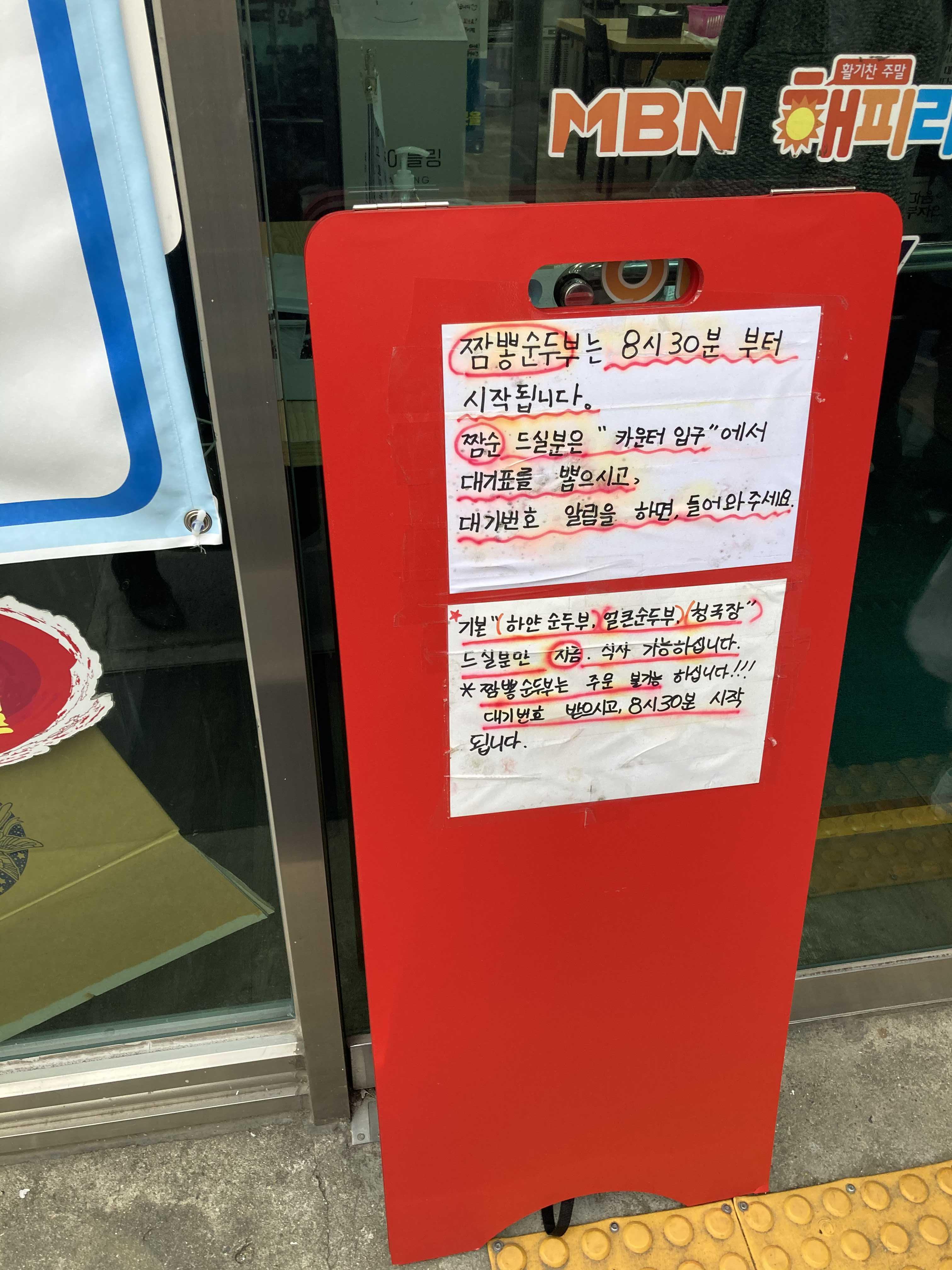 게다가 우리는 도착해서 알았는데 짬뽕순두부는 8시 30분부터 판매를 시작하고 '하얀 순두부, 얼큰순두부, 청국장'은 바로 식사가 가능하다고 한다.