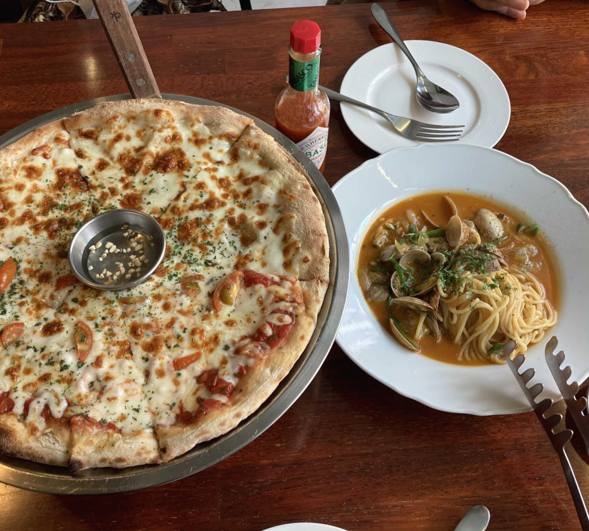 나는 제부도 봉골레, 반반 피자를 시켰다.