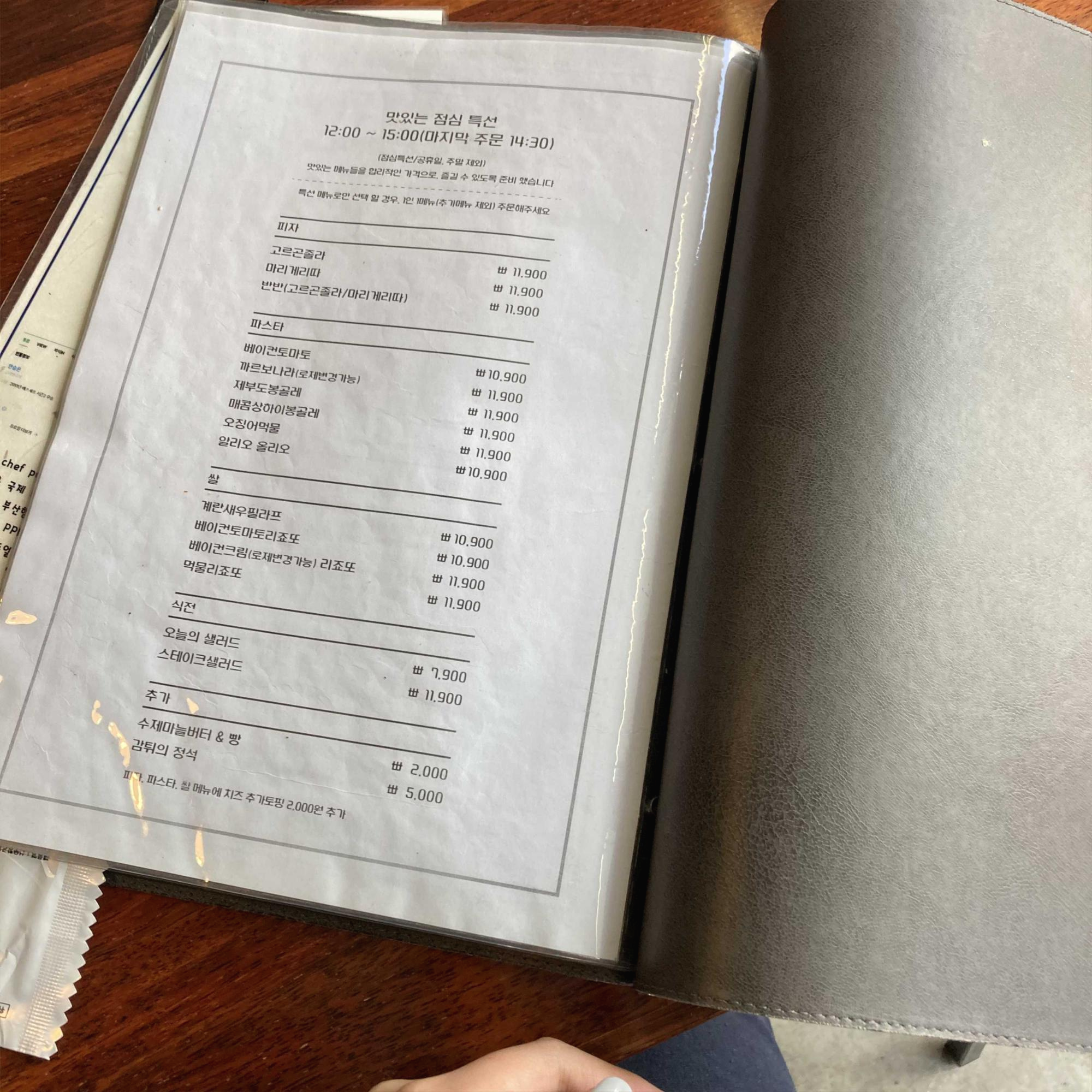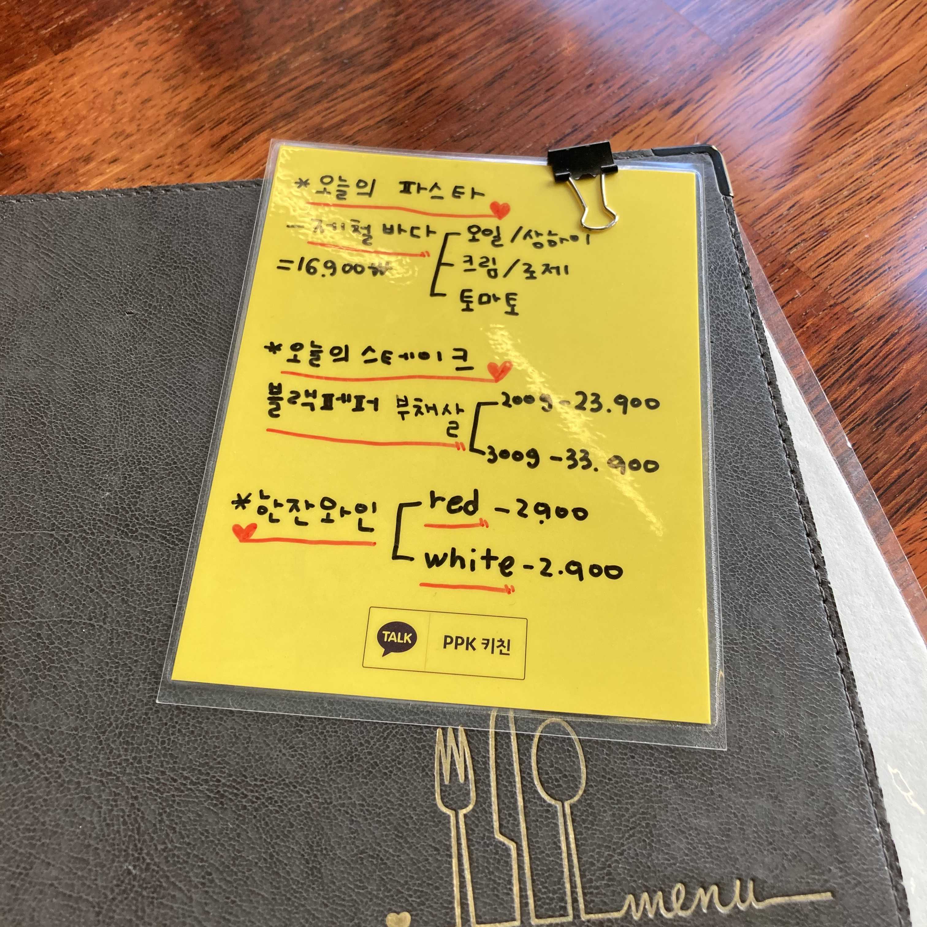 메뉴판 첫페이지에 오늘의 파스타가 적혀있다.