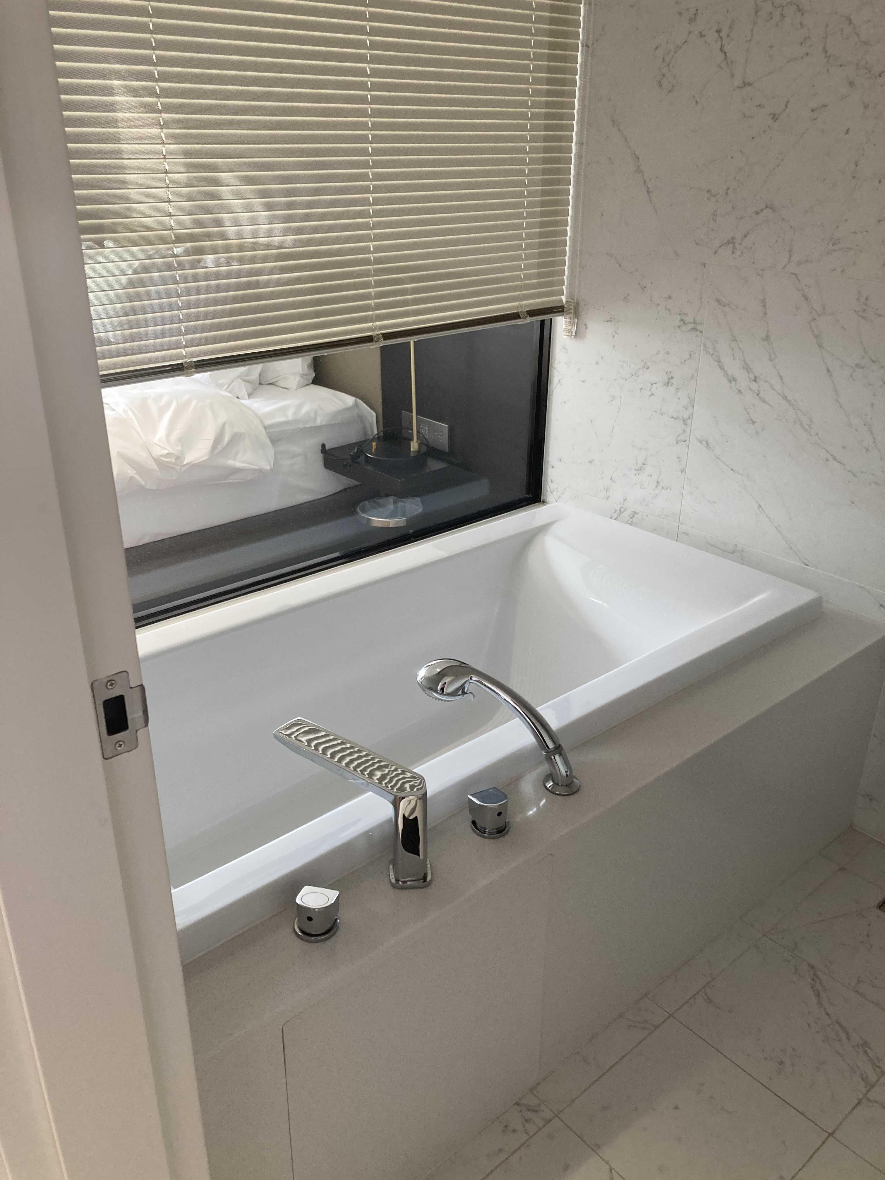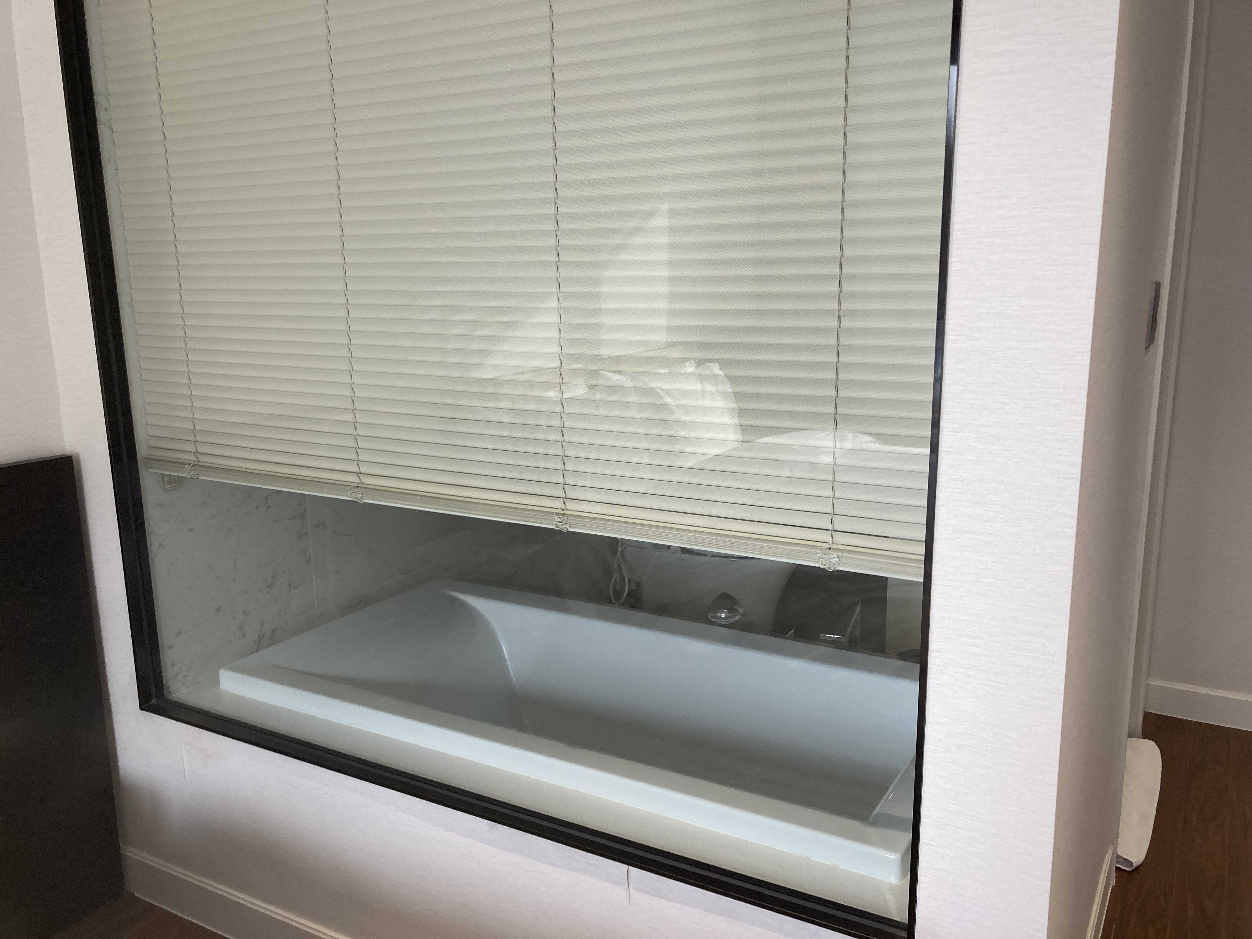 욕실은 이렇게 밖에 보이게 해둘수도 있고, 블라인드를 내려서 사용할 수도 있어요.