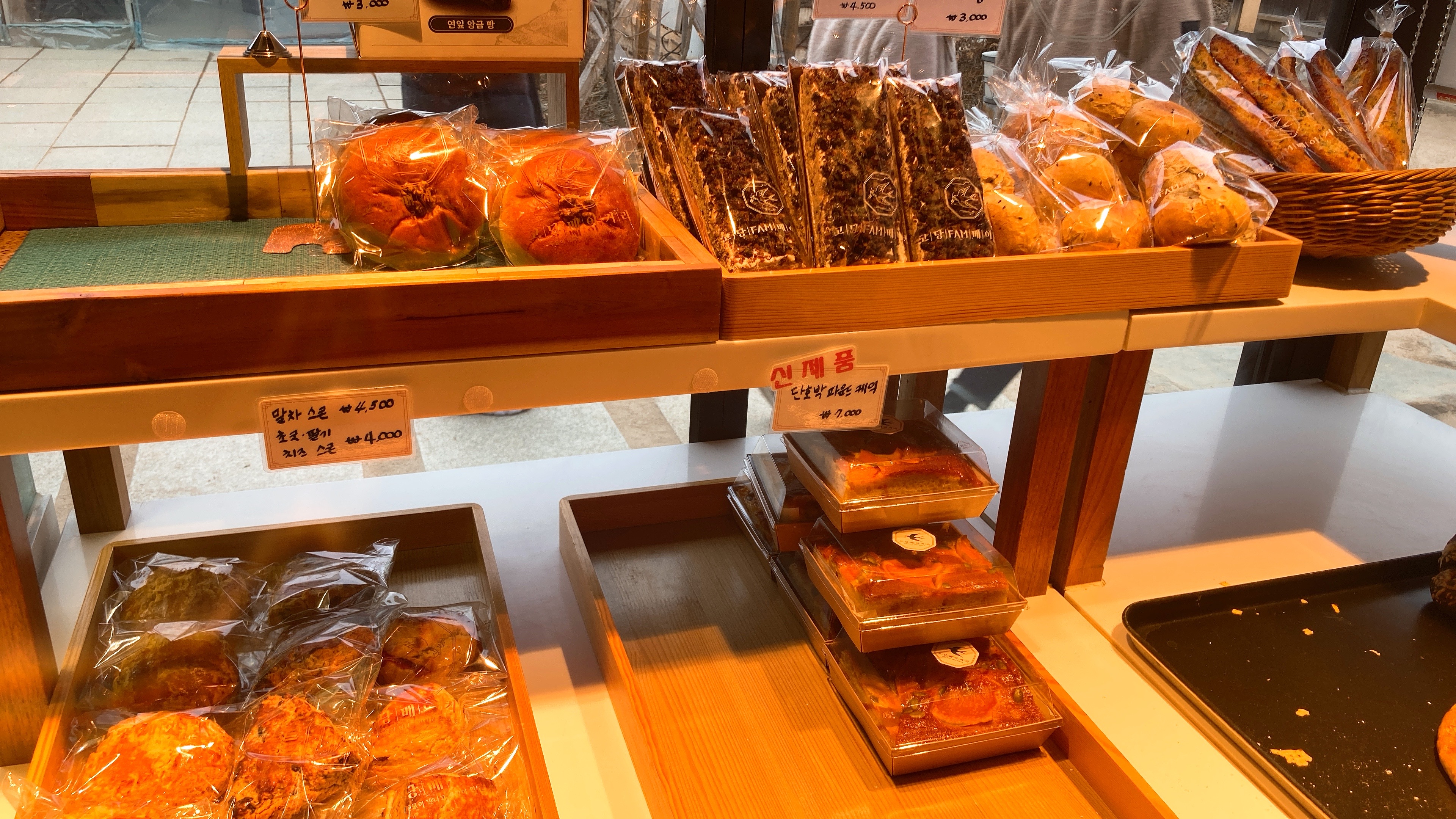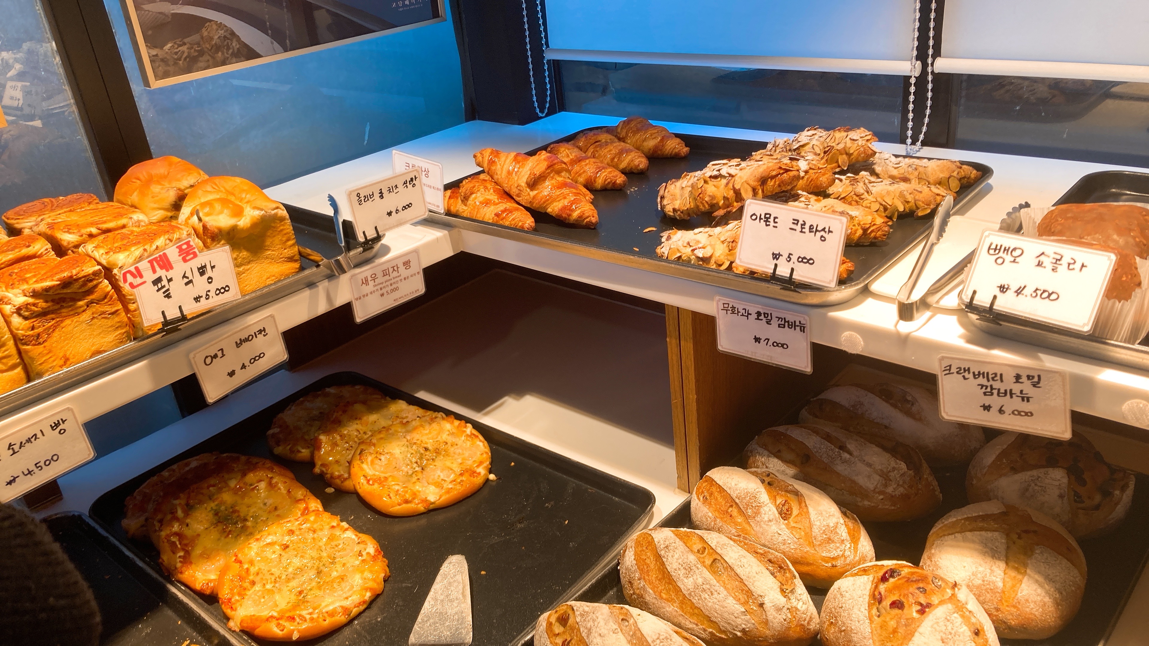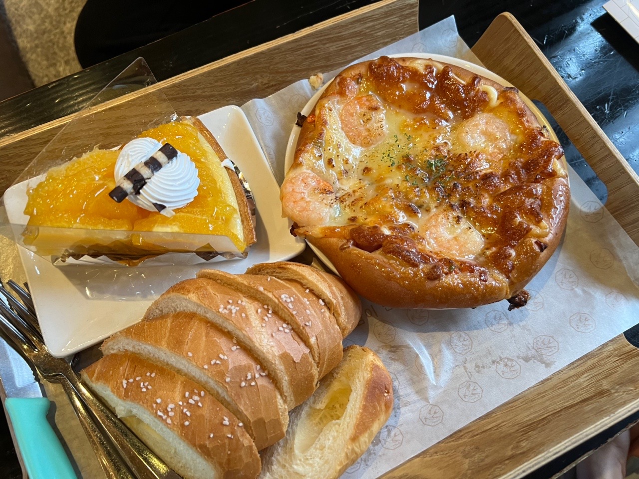 너무 많은 메뉴가 있어서 고민했지만, 우리가 고른 메뉴는 새우피자빵, 솔트빵(소금빵), 오렌지 크림치즈 타르트 이렇게 세개를 골랐다.